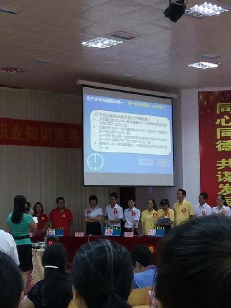 經過三個月的初賽、復賽迎來了今天的決賽,生產企業無菌組決賽共分為三個環節:必答題,搶答題,風險題。在決賽的現場,我們參賽選手反應迅速,密切配合,展現豐富的知識,秀出了我們的風采。我們公司啦啦隊穿著統一服裝來到現場為我們的選手吶喊、助威!并秀出我們公司的口號“秀出自信,展現自我,非比尋常,長安最強”。